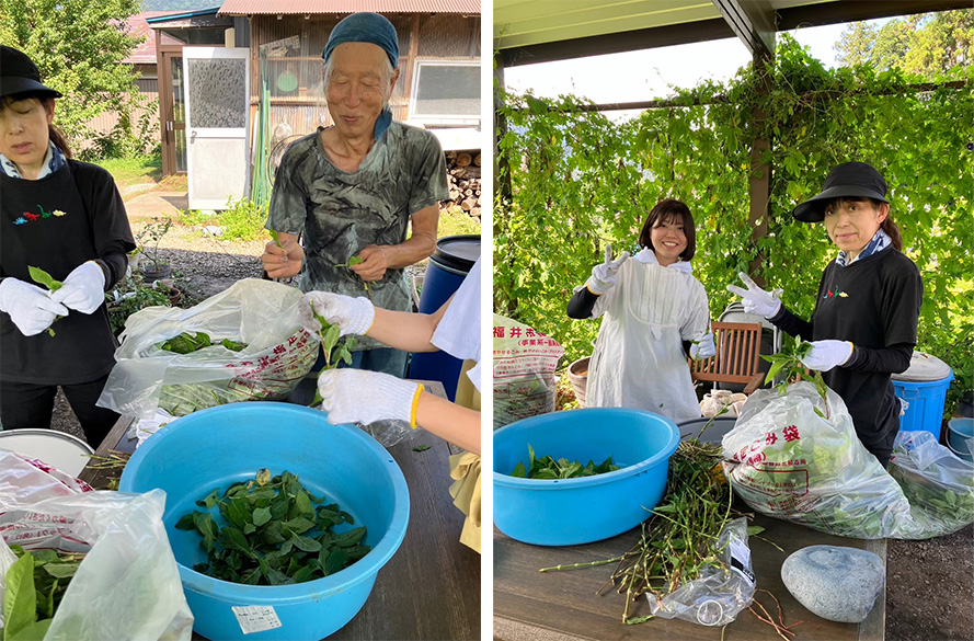 分ける作業: 刈り取った後は、葉と茎に分ける地道な作業。