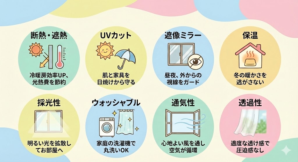 - UVカット: 大切な肌や、お気に入りの家具を日焼けから守ります。