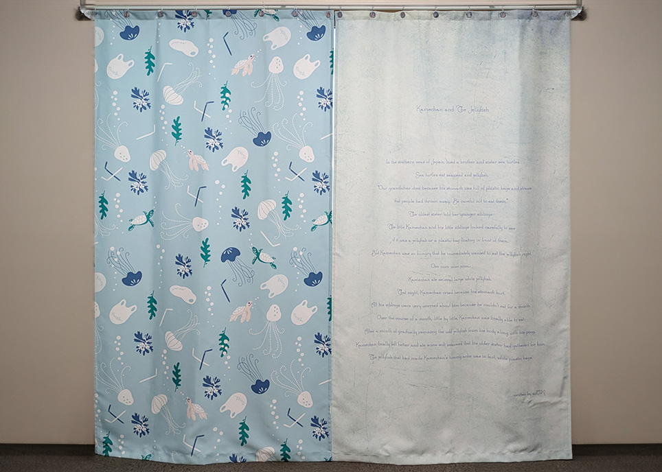 現在は、身近なものを題材に思い出をもっとおしゃれに連結できるレジャーシート「ムードラグ」だけでなく、新たに環境問題をデザインに取り入れた「絵本カーテン」も加わり、ショールームもより賑やかになりました!実際に軽さや触り心地を体感できるスペースもあります。