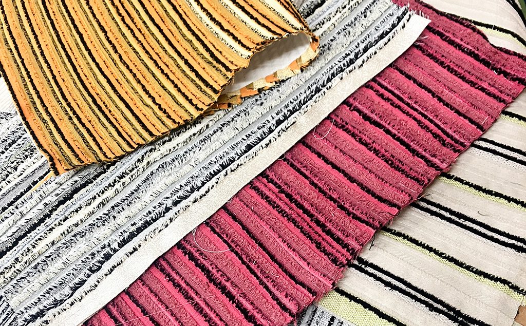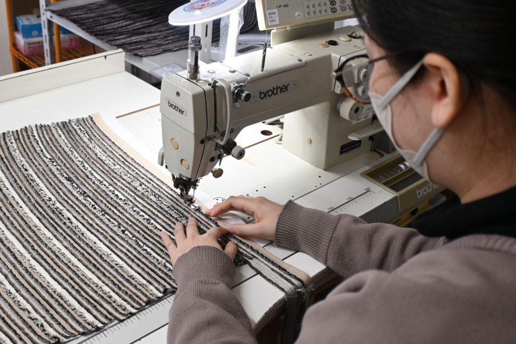 matectの生地は、さまざまな背景を持つ方々が個性を活かして働く就労支援施設の方々にお願いしています。色分けされた生地耳の組み合わせや順番は、すべて縫製担当の方の感性に一任。出来上がった生地は本社工場のNV工程で製品化されます。