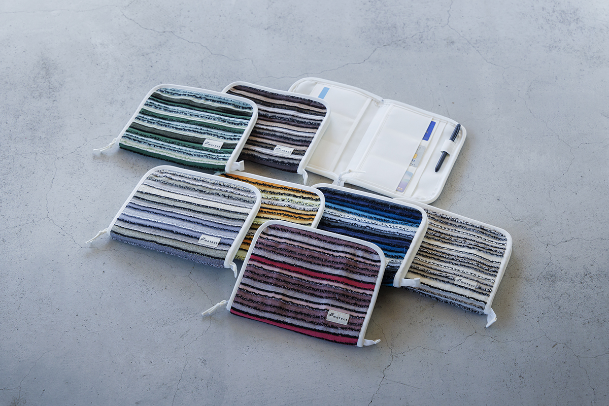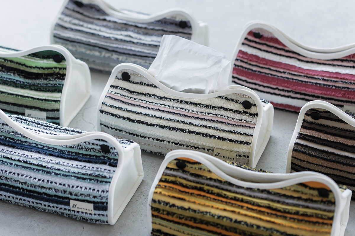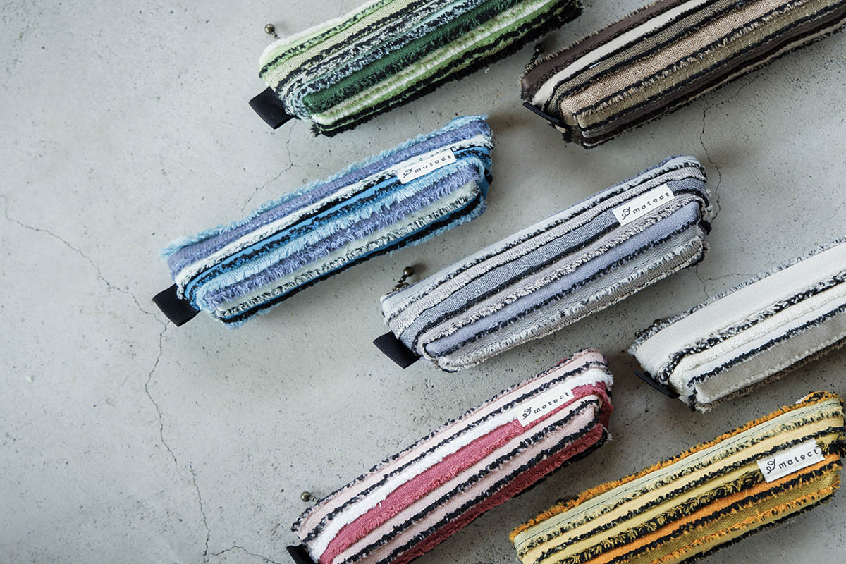 Matectの文具&雑貨はペンケースやブックカバー、ティッシュカバー。どれも一点ずつ表情が異なり、同じものはひとつとしてありません。