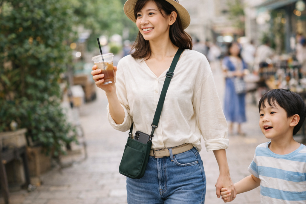 両手が自由に使えるので、荷物の多いお買い物や、お子様と手を繋いでの移動もスムーズに。身軽になることで、いつもより一歩遠くまで歩きたくなるから不思議です。