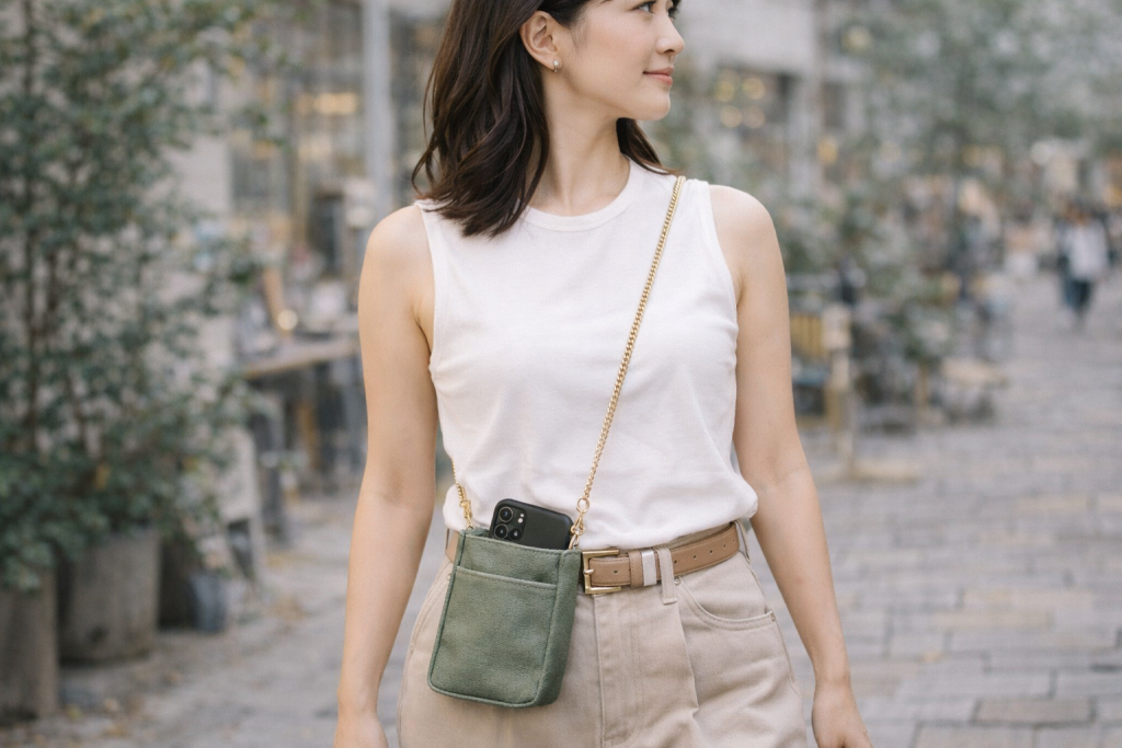 最近のスマホショルダーは、もはやバッグというよりアクセサリーの一部。シンプルな服装でも、肩からひとつ掛けるだけで、今っぽくこなれたおしゃれな印象に仕上がります。