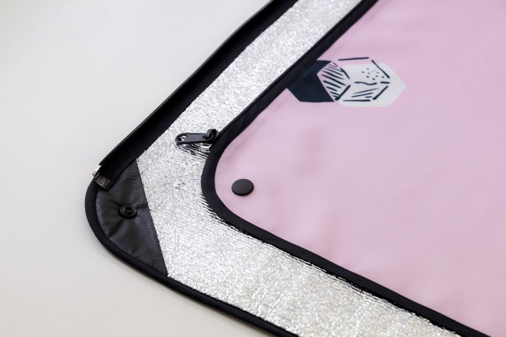 底面には断熱性や保温性に優れたアルミ蒸着フィルムを使用し、厚さは3mmとクッション性を考慮。もちろん撥水加工付きです。