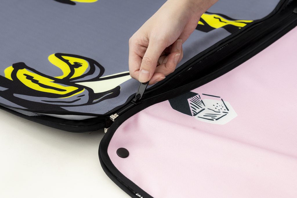 この2層構造はジップで簡単に切り離すことができ、プリント柄のある表面だけ洗濯機での丸洗いが可能。食べこぼしなど汚れるたびに遠慮なく洗えます。ファミリーには嬉しいポイント。