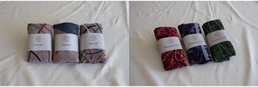 トートバッグ、サコッシュ、ラッピングクロスには、統一デザインの帯を採用。